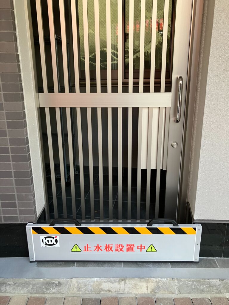 店舗マンションの店舗入口と通用口に止水板マグネットタイプ